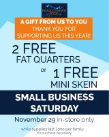 Stop by the shop on Small Business Saturday and get a free gift just for stopping by because we love our customers, while supplies last. (Online shoppers will get a free gift with purchase.)