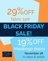 Tomorrow, Black Friday, stop into the shop or order online to get 29% off all fabric cuts of 1 or more yards and 19% off all Malabrigo yarns. (Remember to bring in your license plate number to get free parking.)
